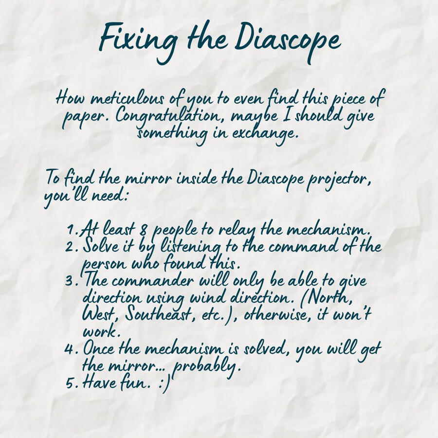 Moving to the side where the device settled, he meticulously examined it with his Enhanced Sight ability. An empty slot—something should’ve been there.“Indeed, something is missing,” he mumbled to himself, “This Epidiascope’s mechanism is quite simple. Here, let me—,” his words trailed off as he got a piece of used, almost crumpled paper inside his pocket and drew the structures inside the Epidiascope.“Whoops—sorry for the little note, p-please ignore it,” Wise nervously covered it with his thumb before clearing his throat, continuing the explanation.